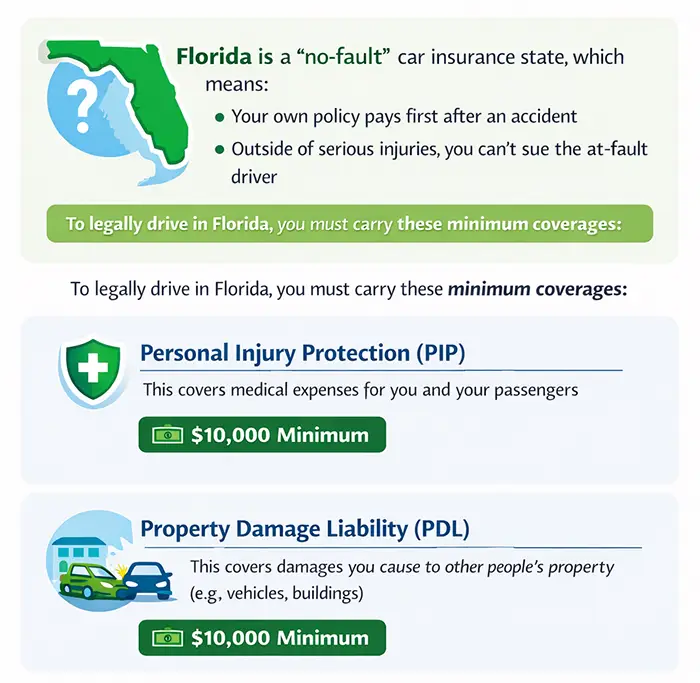 Florida is a no-fault insurance state, which means your own policy pays first after an accident. To legally drive in Florida, the state requires: